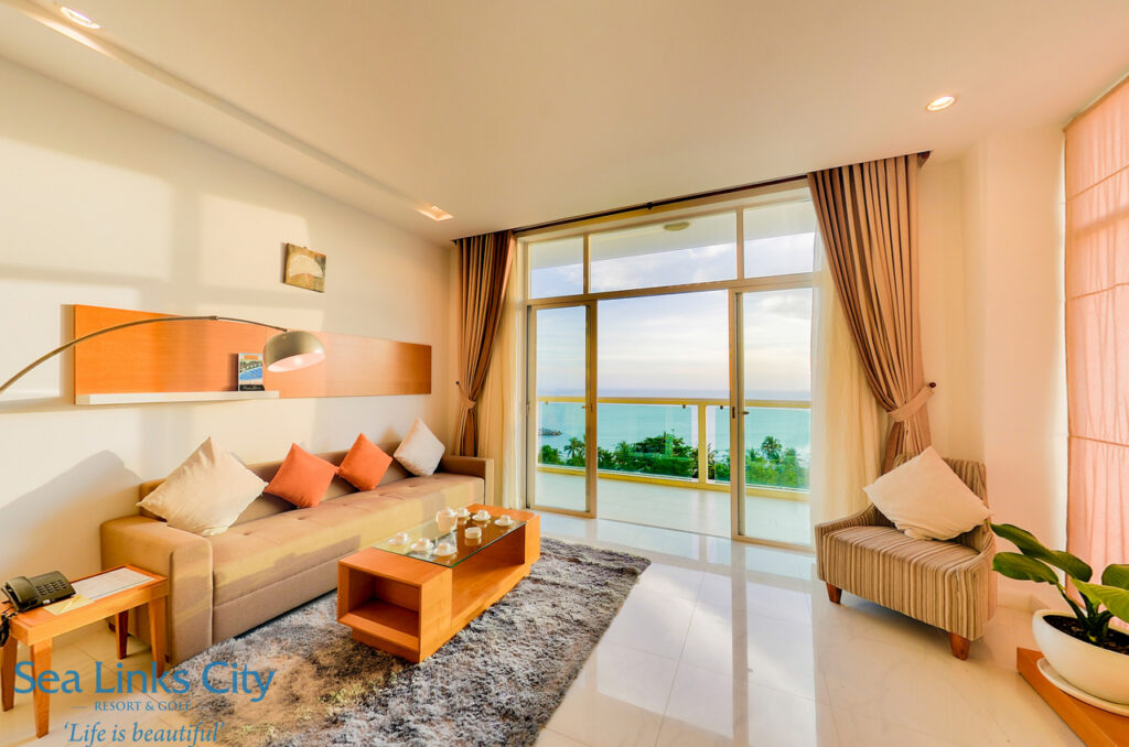 Căn hộ được thiết kế theo phong cách hiện đại và trang nhã với không gian thoáng đãng bao gồm phòng khách, bếp, phòng ngủ với bàn làm việc và được trang bị đầy đủ tiện nghi. Từ ban công của căn hộ quý khách có thể nhìn ra sân golf Sea Links hoặc thư giãn trên ghế sofa.