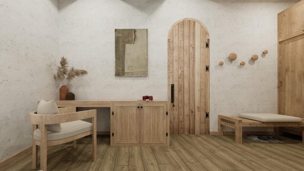 - Phòng khách với ghế sofa, tivi và dàn karaoke.
