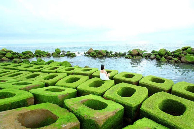 Kè chắn sóng Xóm Rớ là nơi có những kè chắn sóng phủ đầy rêu xanh tạo nên một cảnh quan tuyệt vời. Khi thủy triều xuống, những chiếc kè nổi lên xanh mướt, óng ánh dưới ánh nắng mặt trời, một khung cảnh khiến nhiều người đam mê chụp ảnh không thể làm ngơ.