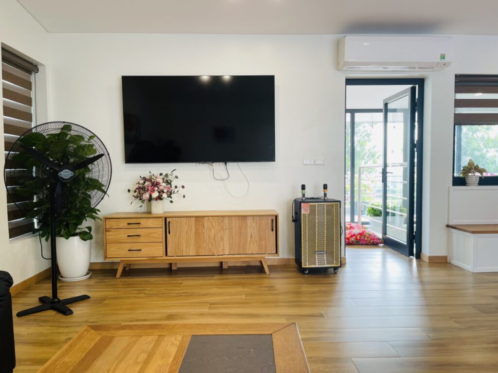 – Phòng khách rộng với sofa êm ái, tivi khổng lồ và view paronama ra sân golf xanh mướt