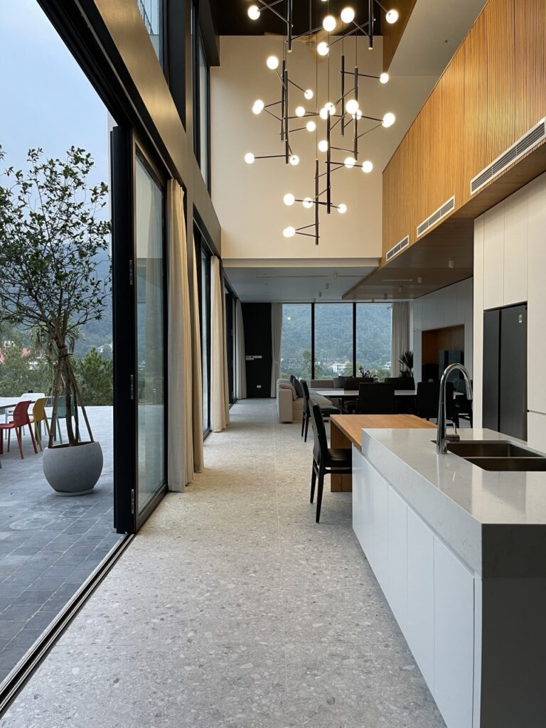 – Phòng khách lớn với thiết kế mở, view sân golf view bể bơi, nối liền với phòng ăn và bếp tạo ra ko gian sinh hoạt chung ấm cúng
