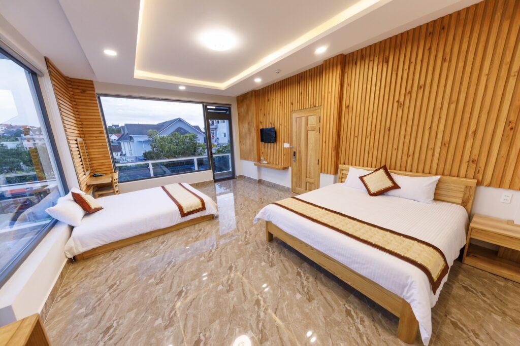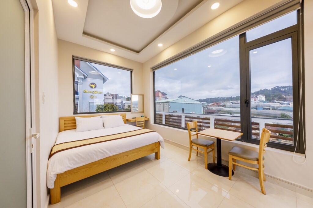 • Các phòng nghỉ đầy đủ tiện nghi tầm nhìn ra thành phố hoặc thung lũng trồng nông sản