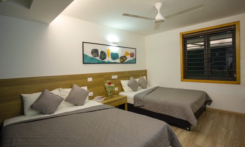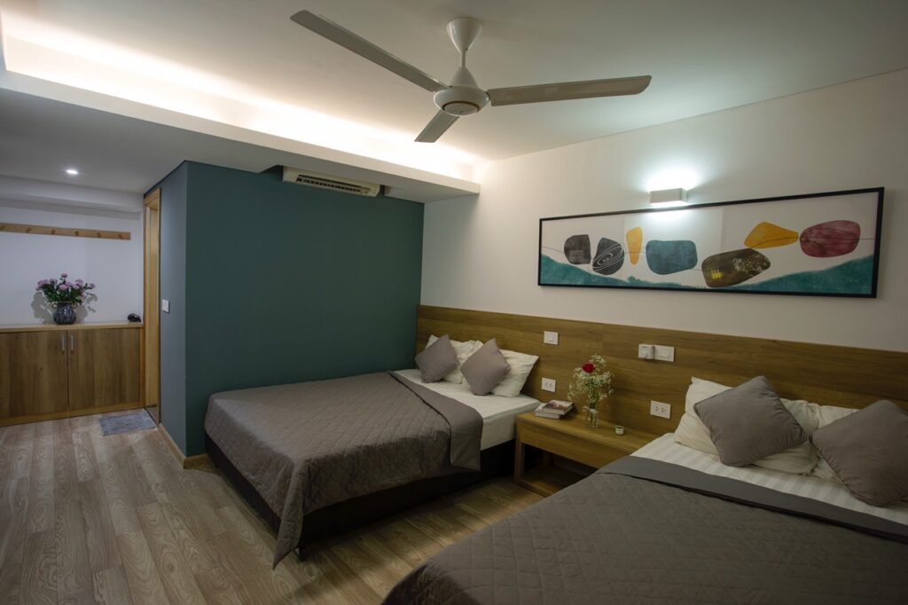 – 5 phòng ngủ, trong đó có 1 phòng 2 giường và 4 phòng 1 giường, 5WC ( 4 giường 1m6, 1 giường 1,8 m, 1 giường 2m ) và 3 đệm phụ 1m6, 4 sofa bed