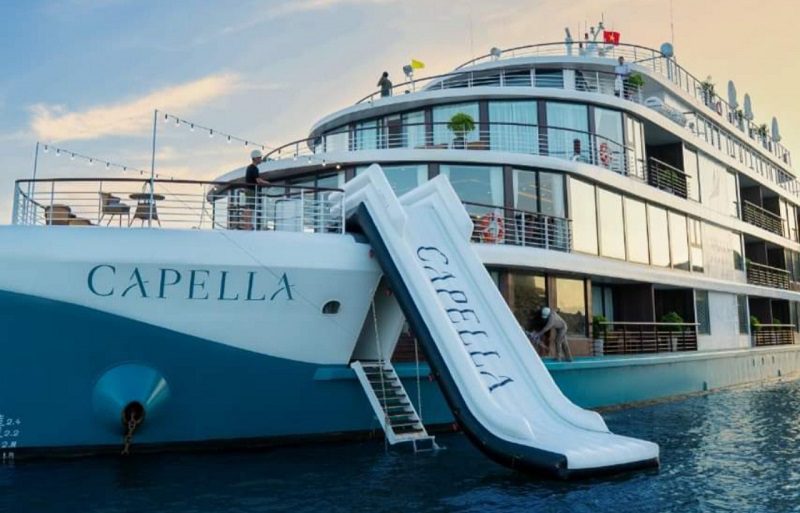 - Máng trượt nước: Capella là một trong số rất ít du thuyền ở vịnh Lan Hạ có máng trượt nước. Từ tầng 2 của du thuyền bạn có thể trượt xuống dưới biển và thỏa sức tham gia các hoạt động vui chơi giải trí dưới nước.