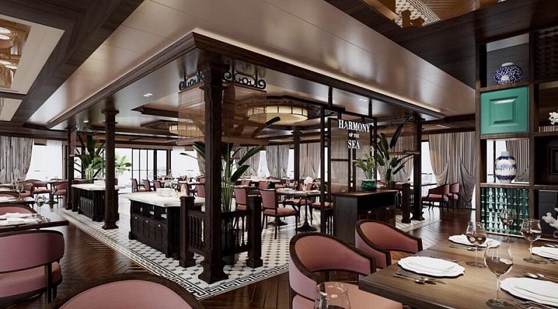 - Nhà hàng Harmony of the Sea: Nhà hàng của du thuyền với vị trí trên tầng 2, được trang trí với không gian ấm cúng và sang trọng. Nhà hàng có sức chứa tới 80 người, phục vụ thực đơn ăn theo set, buffet…