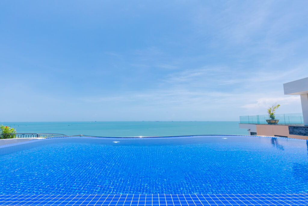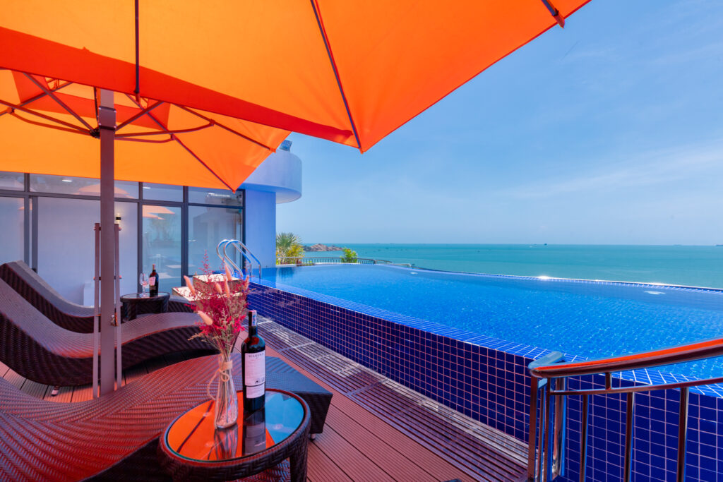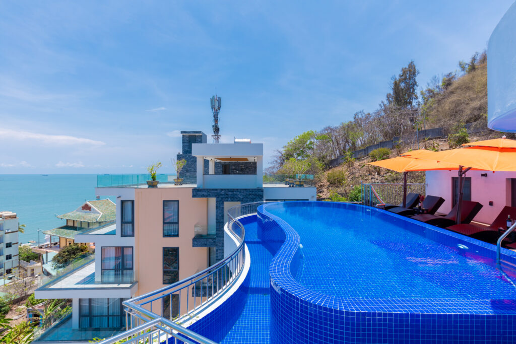 – Hồ bơi vô cực nằm trên sân thượng với view biển tuyệt đẹp, hệ thống massage. Có ghế nằm tắm nắng thư giãn.