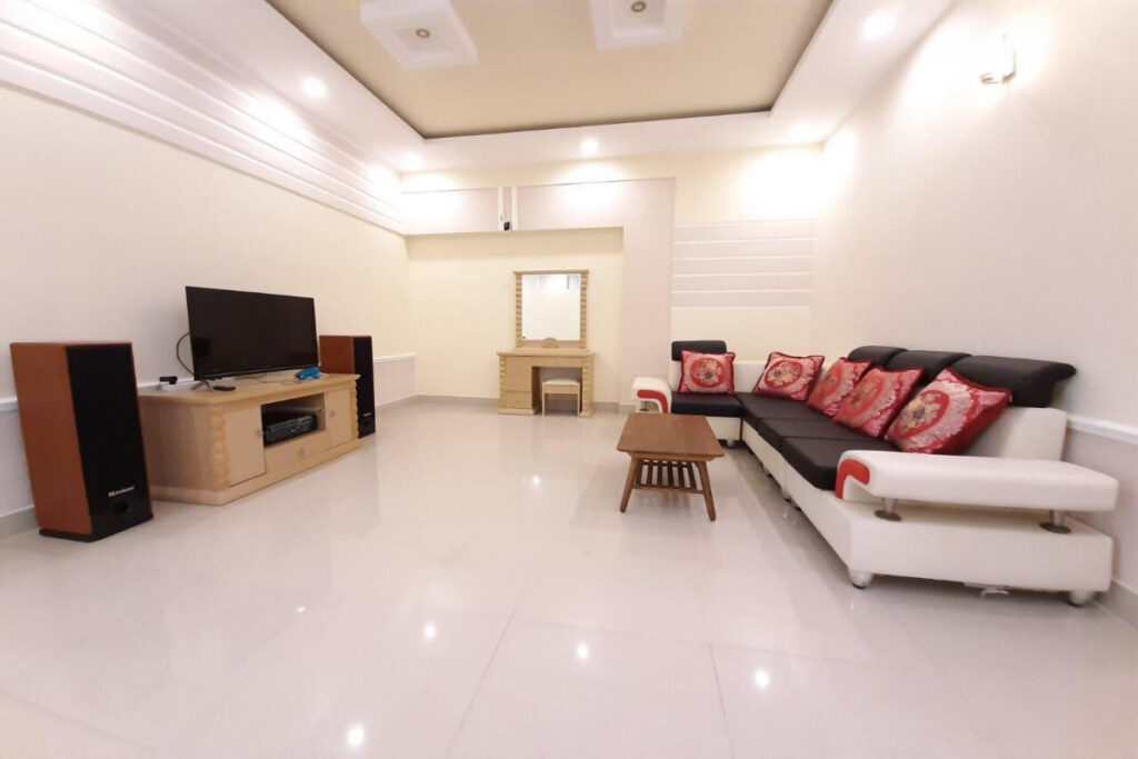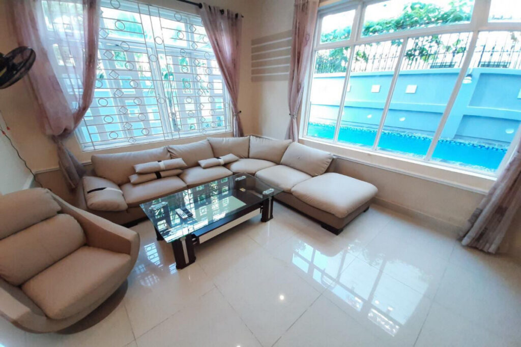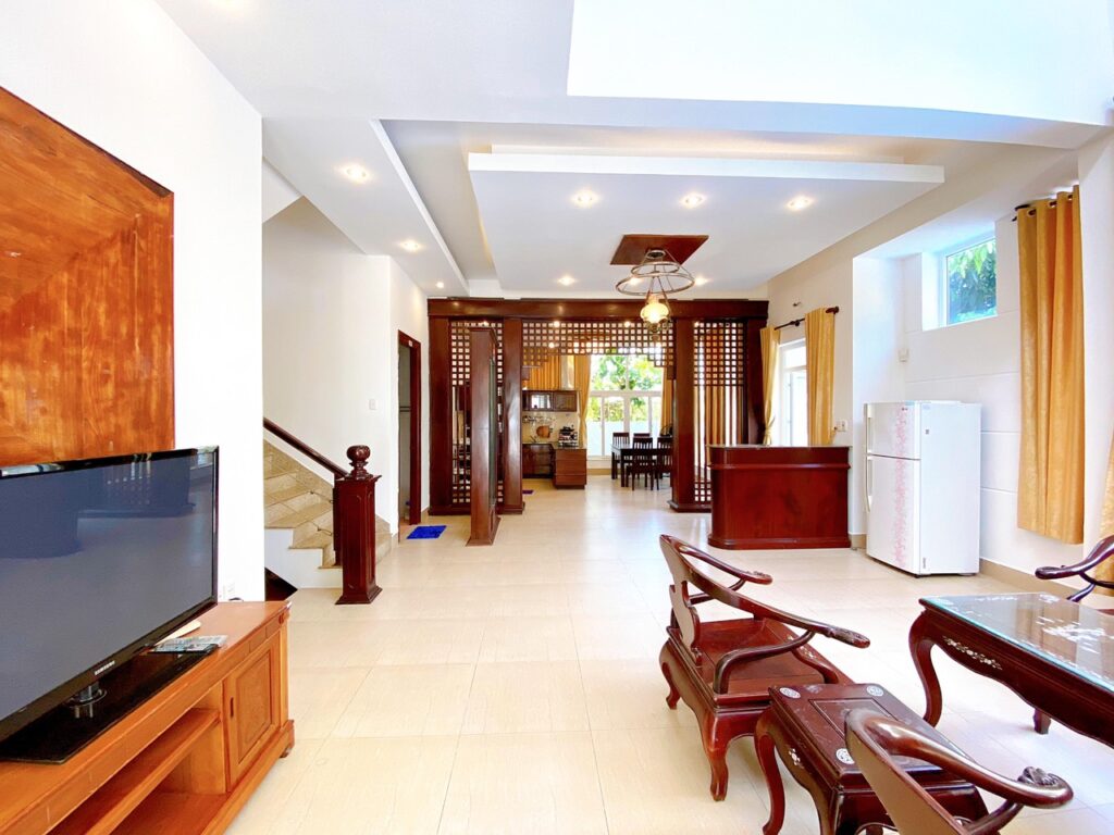 – Villa có 1 phòng khách với sofa rộng cùng 1 phòng bếp rộng rãi đủ bếp gas, lò nướng, máy xay, gia vị, dụng cụ nấu ăn… Phù hợp với gia đình, nhóm đông người, có phòng karaoke cách âm, sân vườn trang trí đẹp có thể tổ chức tiệc BBQ ngoài trời hoặc thả mình thư giãn ở hồ bơi rộng.