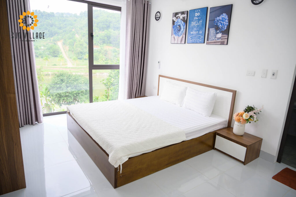 Sun Village thiết kế với cửa kính lớn dù nghỉ ngơi thư giãn ở phòng nào bạn cũng được chiêm ngưỡng khung cảnh núi đồi bát ngát, hay nhìn ngắm làn nước trong xanh phía hồ Gò Cáp thơ mộng.