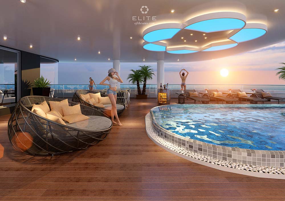 Du thuyền Elite of The Seas là du thuyền đẳng cấp 6 sao có bể bơi dát vàng đầu tiên tại Việt Nam. Du thuyền Elite of the Seas được thiết kế dựa trên ý tưởng về phong cách hiện đại, sang trọng, tinh túy. Với các tiện ích nổi bật: Bể bơi vô cực dát vàng với jacuzzi massage, Sân Mini-golf, Hầm Cigar – Rượu vang, Hầm Cigar – Rượu vang, Hầm Cigar – Rượu vang,….