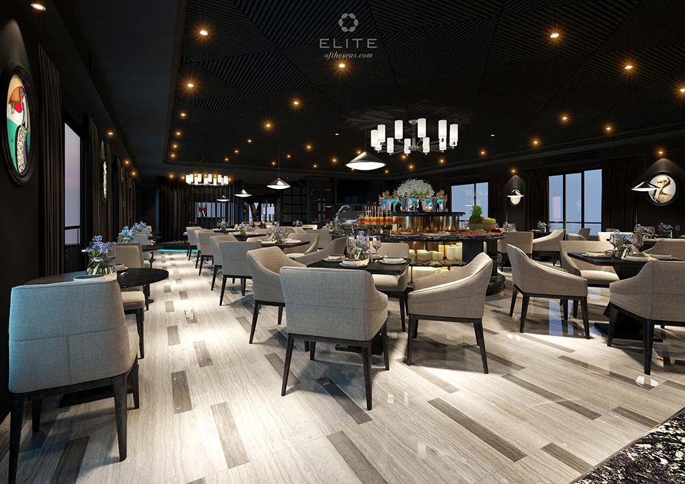 Nhà hàng nằm trên tầng hai, được thiết kế theo phong cách châu Âu đầy quý phái và lịch lãm. Với không gian sức chứa lên đến 100 khách và nhà bếp mở, Elite of the Seas sẽ là một điểm nhấn nổi bật. Khó quên trong các buổi tiệc đặc biệt của khách hàng như tiệc cưới, hội thảo, sinh nhật…