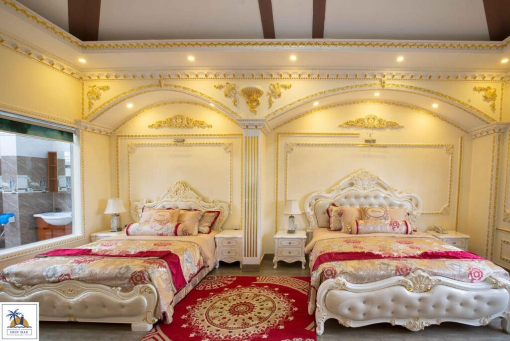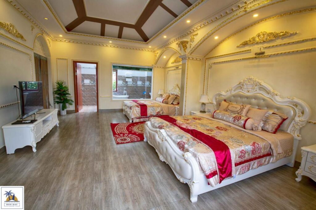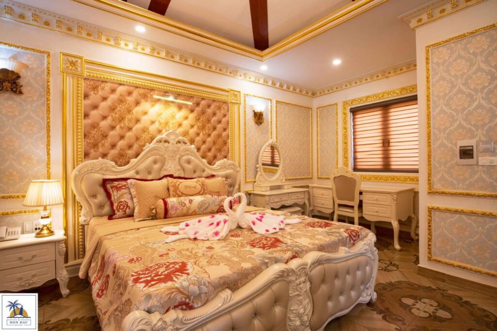 – Loại phòng vip dát vàng, hướng sân vườn, cửa sổ sau hướng biển tuy nhiên bị cây che khuất, diện tích khoảng 30m2, nội thất sang trọng, phòng có bồn tắm, số lượng 3 phòng