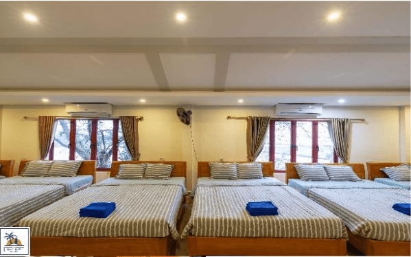 – Phòng 10 giường đôi 1m6*2m, phòng có cửa sổ hướng vườn cây