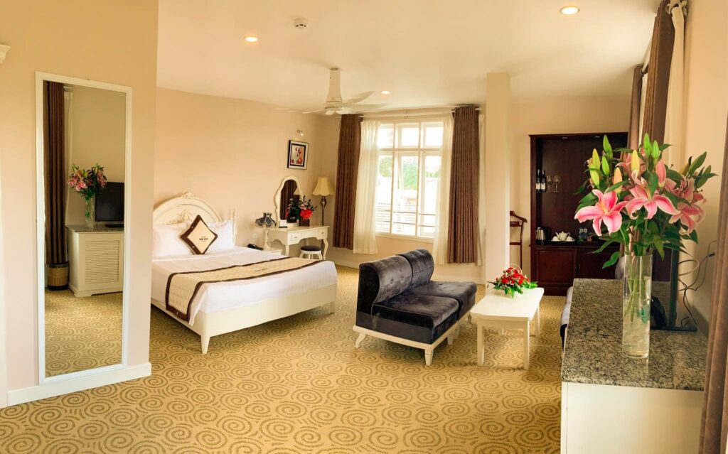 Phòng rộng rãi, sang trọng, yên tĩnh được thiết kế theo phong cách Châu Âu với một phòng ngủ lớn nhìn ra Hồ Xuân Hương và đồi thông. Có khu vực nghỉ ngơi và làm việc rộng rãi, phòng khách, quầy bar