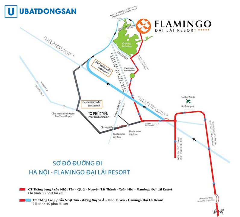 Từ trung tâm thành phố Hà Nội, bạn đi về sân bay Nội Bài theo hướng cầu Nhật Tân. Sau đó, rẽ vào Quốc lộ 2 và đi thẳng tới thành phố Phúc Yên. Tiếp tục đi tới Xuân Hòa là sẽ tới hồ Đại Lải. Tại đây, bạn đi theo biển chỉ dẫn là sẽ tới Flamingo Đại Lải.