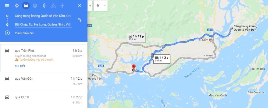 Bản đồ di chuyển từ càng hàng không quốc tế Vân Đồn tới Bãi Cháy