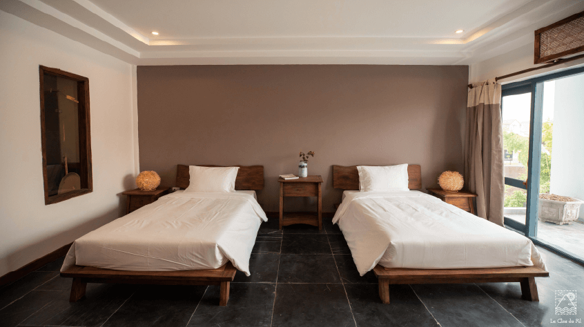 Tất cả các phòng được thiết kế đơn giản, kết hợp với ban công và cửa sổ lớn tạo nên một không gian rộng rãi, thông thoáng và tràn ngập ánh nắng tự nhiên. Từ cửa phòng có thể nhìn ra vườn, làng quê, bể bơi hay cánh đồng lúa mênh mông.