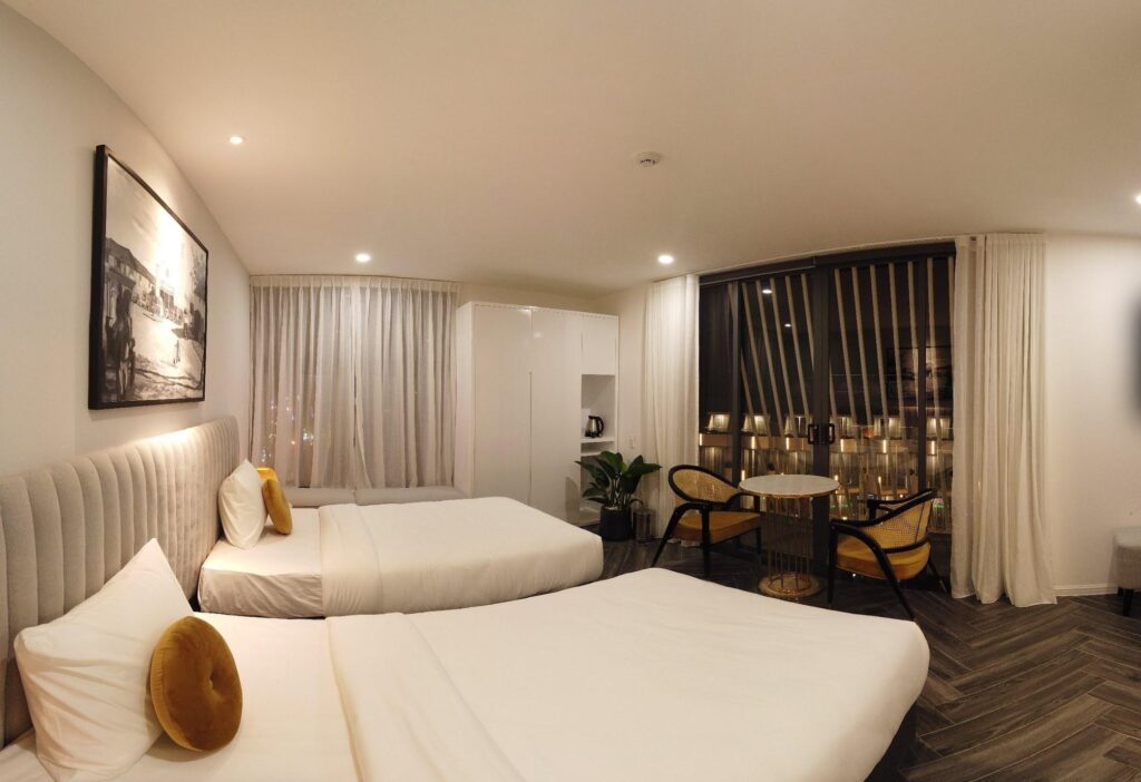 Phòng có diện tích khoảng 28m2, gồm có 1 giường King lớn hoặc 2 giường đơn. Phòng thích hợp dành cho 2 người lớn và 1 trẻ em. Phòng có cửa sổ mở hướng nhìn ra khu vực Thành phố.