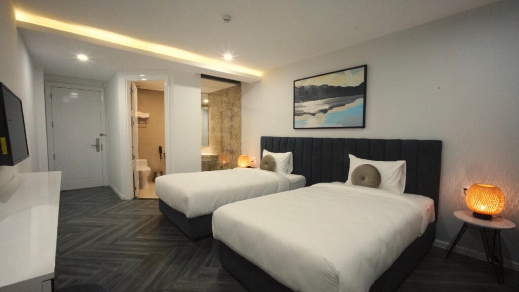 Phòng có diện tích khoảng 25m2, gồm có 2 giường đơn. Phòng thích hợp dành cho 2 người lớn và 1 trẻ em.