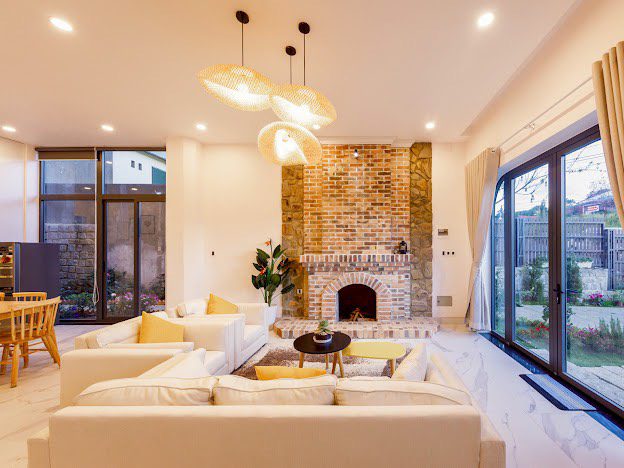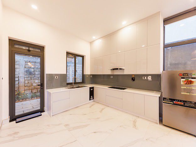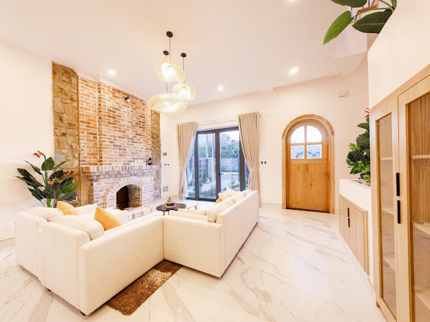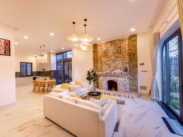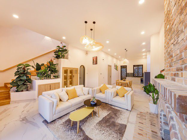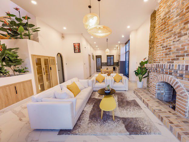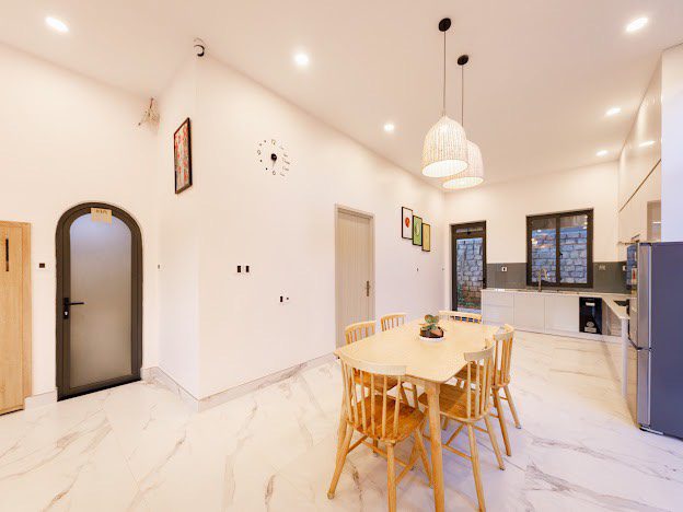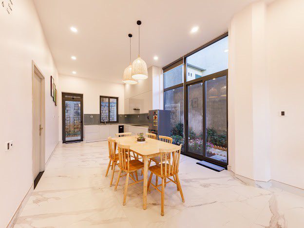Phòng khách, bếp, sang trọng đầy đủ tiện nghi, khoảng sân rộng tươi mát tạo cảm thư giãn cho du khách và tổ chức tiệc BBQ thoải mái.