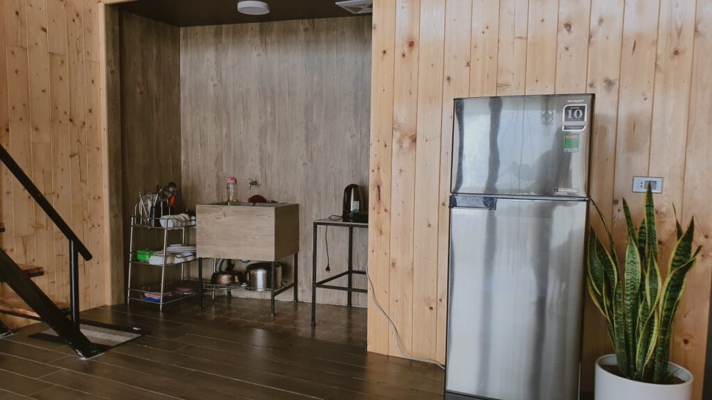 ? Phòng bếp đầy đủ đồ dùng, tiện nghi:tủ lạnh,bếp lẩu, nồi , chảo, bát đĩa…