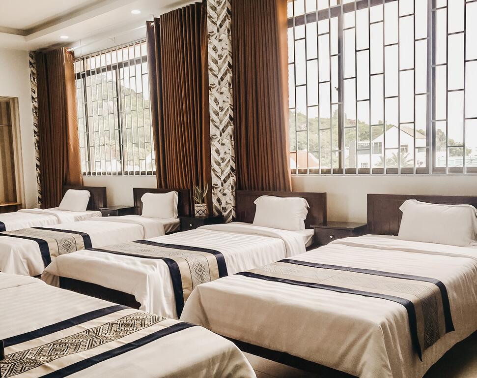 Phòng tập thể 2 giường đôi và 1 giường đơn  dành cho 5 khách, rộng 28 m2, thoáng mát đầy đủ tiện nghị, nước suối, Wifi và bãi đậu xe miễn phí.