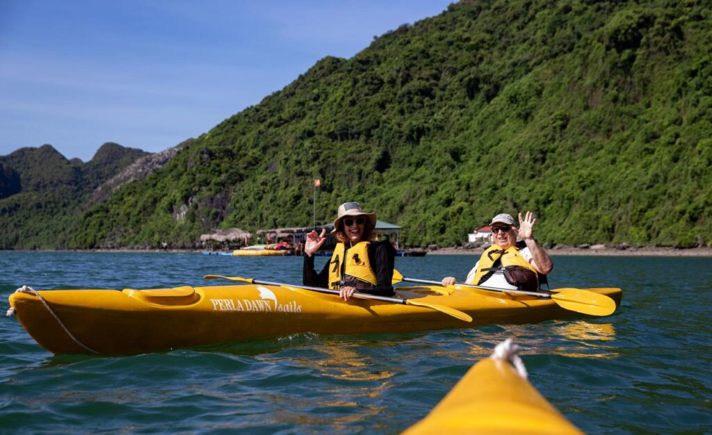 Ngoài ra du thuyền còn có dịch vụ lặn biển,chèo thuyền kayak ngắm vịnh với vô số hòn vôi trắng nguyên sơ