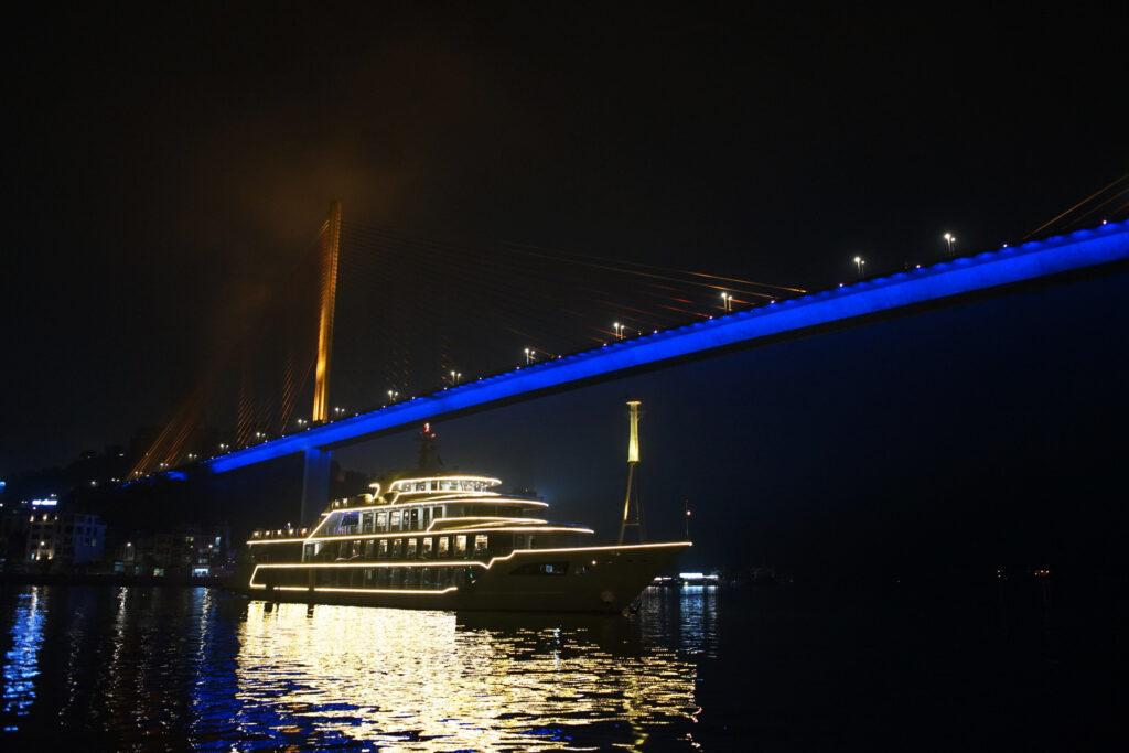 - 18h – 18h15: Du khách có thời gian ngắm nhìn khung cảnh lung linh của thành phố Hạ Long về đêm trong khi du thuyền đang di chuyển đưa du khách đi qua những địa điểm nổi tiếng như cầu Bãi Cháy, Vòng quay mặt trời, núi Bài Thơ, Quảng Trường, bảo tàng Quảng Ninh, cung Cá Heo.