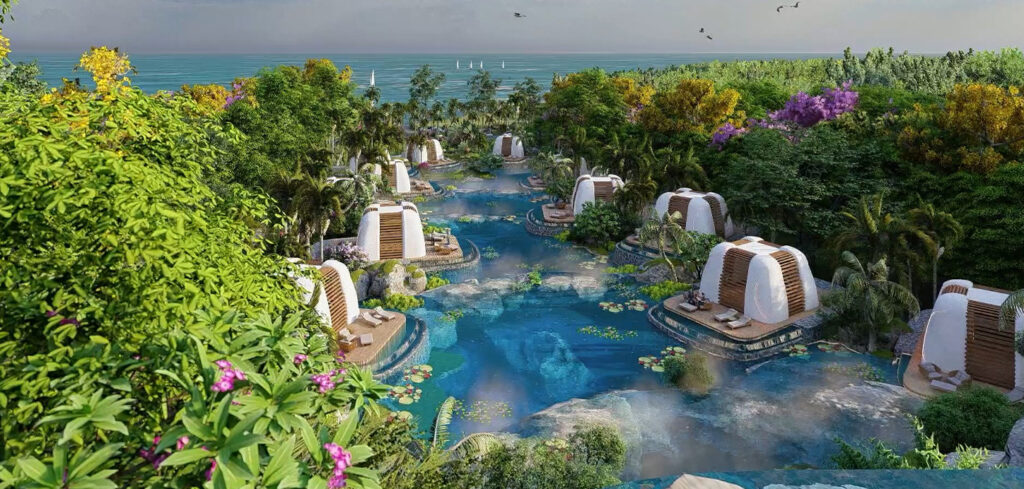 Về thiết kế: Dự án được thiết kế vớ kiến trúc sang trọng, quy hoạch đặc biệt của chuỗi Villas thấp tầng thế đất “tựa sơn hướng thuỷ”, khi tựa lưng vào 03 tòa cao ốc. Đặc biệt dự án được thiết kế độc đáo theo kiểu ruộng bậc thang, đảm bảo tầm view thu trọn đại dương từ mọi góc nhìn. Việc áp dụng công nghệ 4.0 Smart Home được chú đầu tư rất chú trọng nhằm mang tới trải nghiệm sống, nghỉ dưỡng hoàn hảo. Hướng đến không gian xanh mát hòa hợp với cuộc sống của con người, hệ thống căn hộ, khách sạn và biệt thự lắp đặt kính tràn khiến toàn bộ không gian đều hứng trọn ánh sáng tự nhiên. Bên cạnh đó, biệt thự Landscape đậm chất nghỉ dưỡng được bố trí hợp lý dọc các đường dạo bộ thiết kế theo hình ziczac, giúp du khách có thể hưởng thụ bầu không khí trong lành và có được những phút giây thư giãn đích thực.