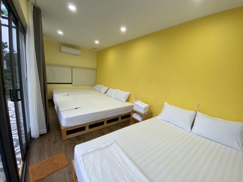 • 1 phòng ngủ tập thể 03 giường view ban công thoáng mát từ đó có thể nhìn xuống hồ câu và bể bơi, 1 nhà vệ sinh chung cùng đầy đủ chăn ga gối đệm dự phòng.