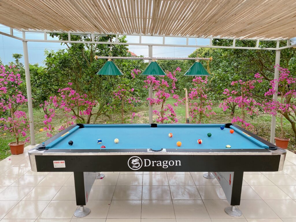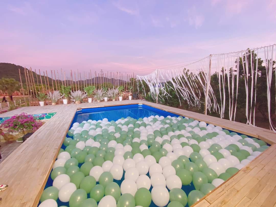 - Bể bơi ốp gỗ rộng gần 100m2Khuôn viên 9500m2 với vườn nhãn, ao cá, vườn bưởi, vườn xương rồng và các background chụp hình siêu lung linh.