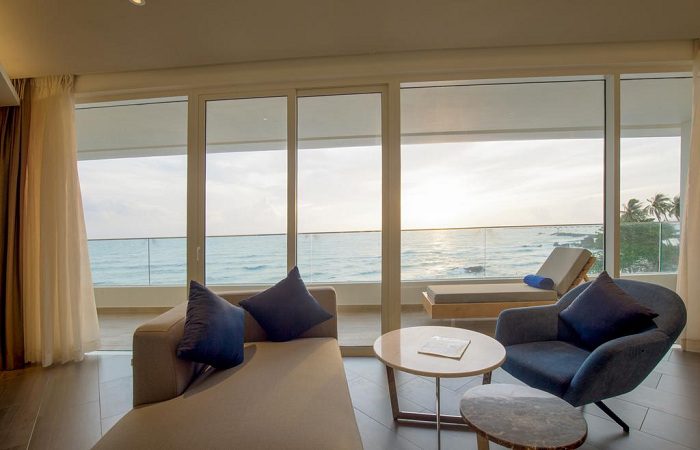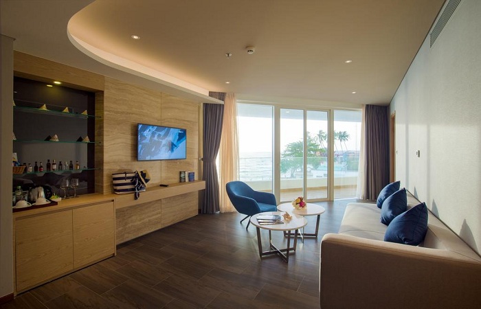 – Junior Suites one bedroom: Hạng phòng có tổng 14 phòng, diện tích mỗi phòng rộng: 40m2, phòng view hướng biển, có ăn sáng, khuyến mãi thêm một số dịch vụ giặt khô, trà chiều,…..