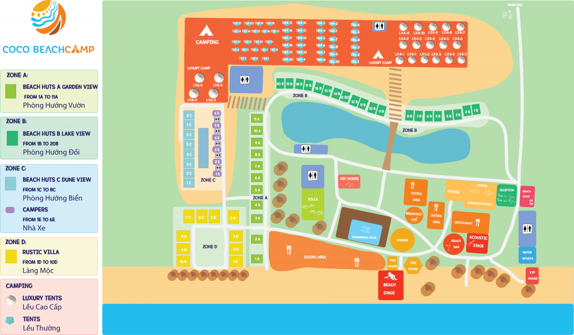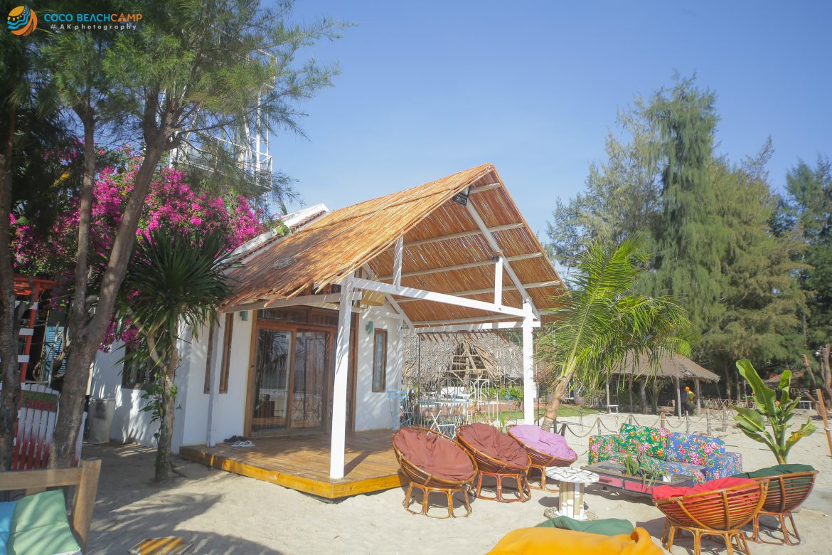 Chỉ với một bãi tắm lớn, một căn biệt thự trắng nhỏ nằm cặp bờ biển, một quầy bar tròn theo phong cách Hawaii, một thư viện lớn. Đặc biệt ở Coco Beachcamp là không có những nhà dãy sừng sững như trong các khách sạn hay resort khác, thay vào đó nơi này có rất rất nhiều những dãy lều đủ màu sắc được dựng sẵn trong toàn khu, kéo dài từ bãi biển cho đến khoảnh sân vườn bên trong. Và đây sẽ là nơi mà bạn cùng tất cả các vị khách khác sẽ nằm ngủ hoặc nghỉ ngơi trong suốt quãng thời gian tìm sự trải nghiệm tại bãi biển có “1-0-2” này.