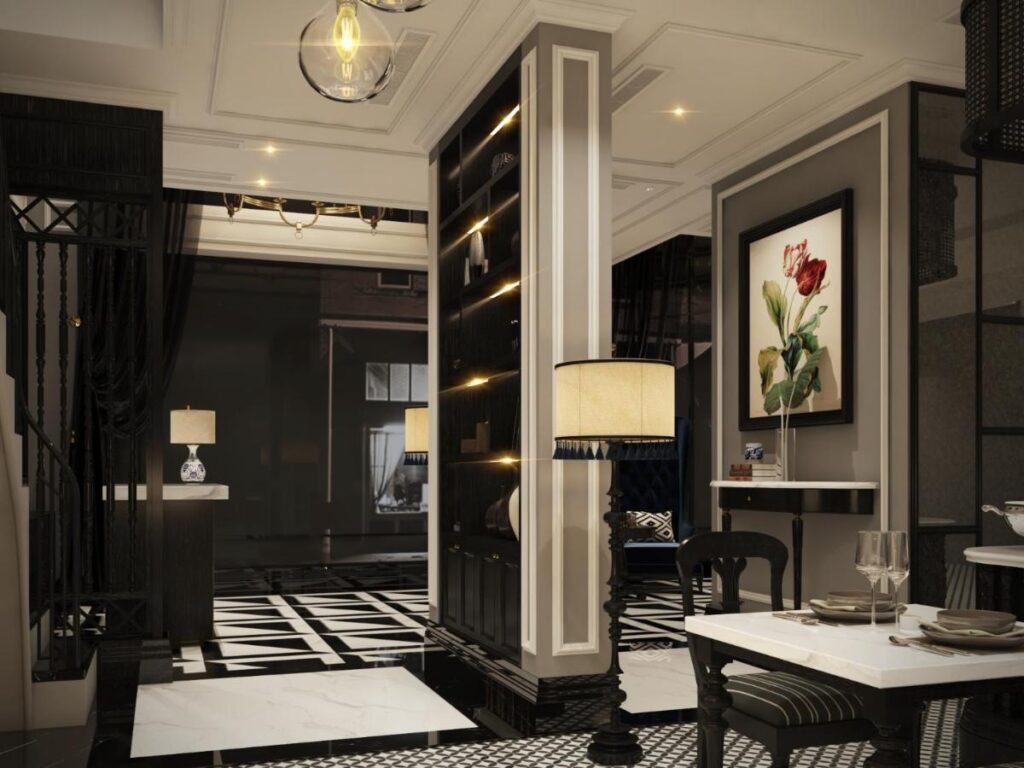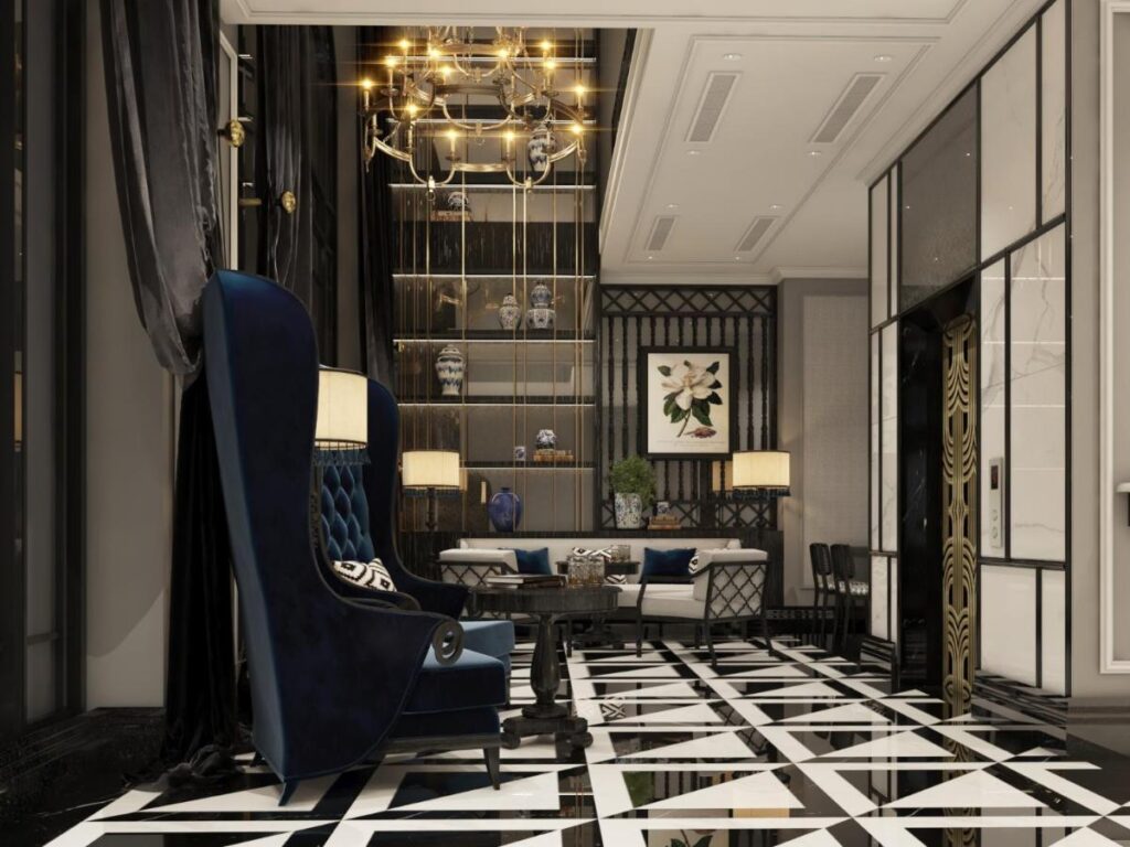 Phòng khách rộng tới 100m2 được bố trí theo phong cách hiện đại xen lẫn cổ điển độc đáo