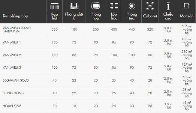 - Phòng đại tiệc Văn Miếu: 586 m2, phòng Đại Tiệc Văn Miếu sẵn sàng cho hội nghị lớn cũng như buổi tiệc riêng tư. Diện tích 580 m2, được trang bị hệ thống âm thanh, ánh sáng đạt chuẩn, internet tốc độ cao, phòng đại tiệc Văn Miếu luôn luôn sẵn sàng cho những sự kiện lớn.