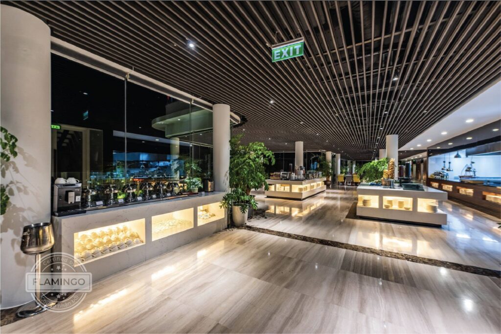 - Nhà hàng phục vụ buffet cho bữa sáng và thực đơn gọi món À la carte vào các thời gian khác trong ngày với không gian bếp mở cùng xe đẩy trình diễn nghệ thuật ẩm thực ngay tại bàn