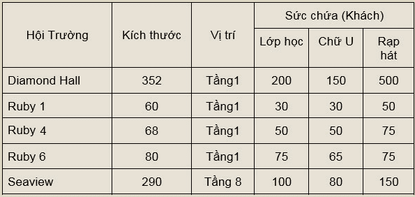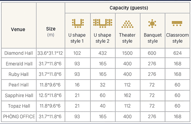Hệ thống hội nghị bao gồm 6 phòng hội nghị quy mô khác nhau :