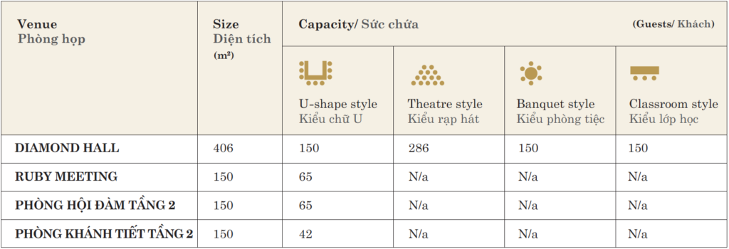 Phòng hội nghị lớn Diamond Hall với diện tích 406 m2 có sức chứa hơn 300 chỗ ngồi cùng hệ thống các phòng tọa đàm nhỏ được trang bị đầy đủ thiết bị hiện đại nhất đáp ứng mọi nhu cầu về hội nghị, hội thảo, triển lãm, hội nghị khách hàng, đào tạo và tọa đàm. Không gian bãi cỏ rộng và thoáng đãng trong khuôn viên khu nghỉ là địa điểm lý tưởng để tổ chức team building và các hoạt động ngoài trời.