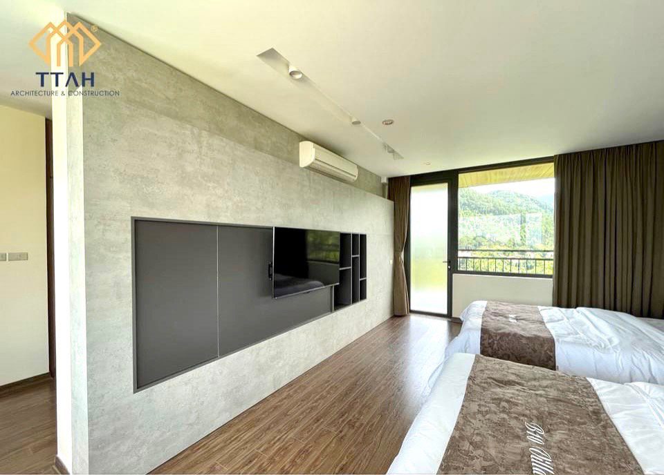+ Phòng ngủ ấm áp với tông màu ấm, có điều hòa, tivi, kệ đồ,…