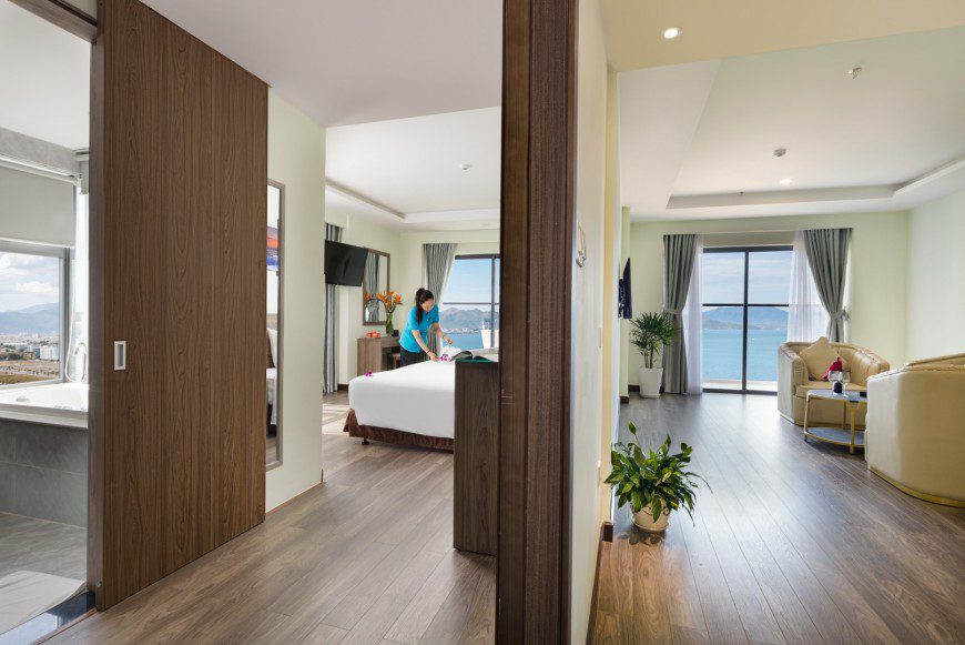 Tận hưởng không gian nghỉ ngơi sang trọng và hiện đại của hạng phòng XAVIA Suite với diện tích lên tới 72 mét vuông. XAVIA Suite là hạng phòng cao cấp nhất của khách sạn gồm một phòng ngủ và một phòng khách riêng biệt. Toàn cảnh vịnh biển Nha Trang xinh đẹp lúc bình minh hay lấp lánh khi hoàng hôn sẽ mở ra ngay trước mắt với ban công rộng rãi, lan can kính trong suốt.
